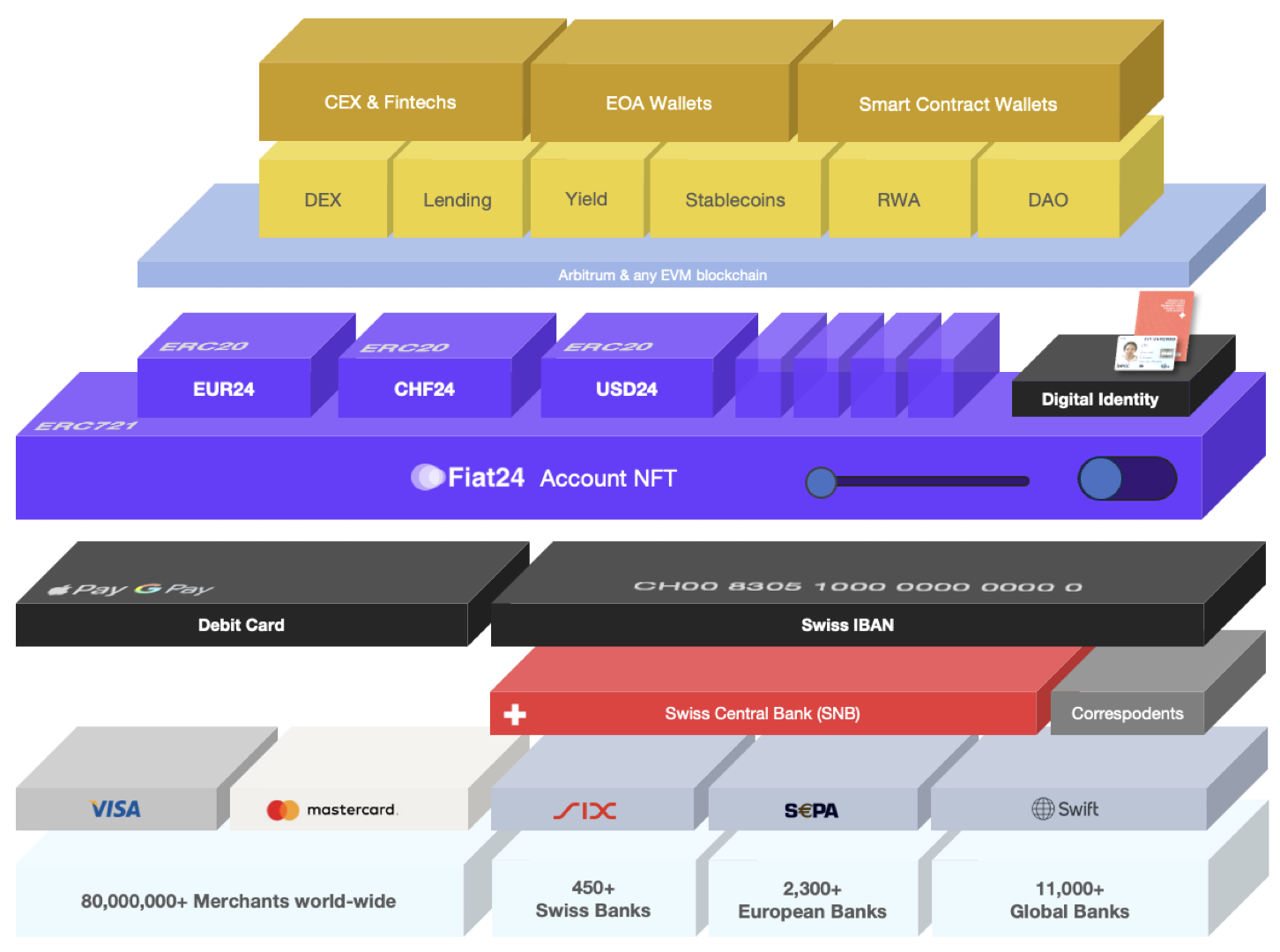 Fiat24 offers Swiss financial services in web3 technologies, with our signature Banking DApp. A web3 application that provides the security of being fully regulated in Switzerland, we are bridging the gap between centralised and decentralised systems and step into the banking revolution.